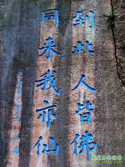 不二門內(nèi)由石灰?guī)r風(fēng)化形成的一尊巨大石佛,聳立于萬(wàn)綠叢中,高六丈,青冠白面,頭頂白云,腳踏碧水,人們以其形神稱為“觀音巖”?!队理樋h志》稱“觀音巖素有‘湘景名峰第一巖’之稱”。觀音巖下,聳立著一組瑰麗多姿、古色古香的殿閣建筑群,這就是“嵩山堂”,包括三觀殿、玉皇閣和禪房客舍,工藝精巧,玲瓏別致。特別是正殿后的地藏庵,與老司城明代建筑祖師殿結(jié)構(gòu)相似,背倚石壁,右通八陣圖,左達(dá)熱水坑,周圍怪石森列,古木參天。觀音巖北部山上是天造地設(shè)的“八陣圖”,有的如排戟,有的似春筍;有的像古佛,有的若走獸。八陣圖之奇,不僅在于它林立的怪石,最主要的是在于由龜裂紋石板鋪成的時(shí)上時(shí)下時(shí)隱時(shí)現(xiàn)的彎彎小徑——或穿過地下幽深的石洞,或延展于密林雜草叢中,或環(huán)繞于奇峰怪石之間,使八陣圖的東、南、西、北四門相通,復(fù)雜繁多的石徑互相連接形成網(wǎng)絡(luò),人們有時(shí)難以找到出路。也許,這就是八陣圖命名的緣由。不二門內(nèi)兩側(cè)石壁開闊如屏,歷代文人墨客或贊山水之幽絕,或抒心胸之豪情,雕鑿了種種摩崖石刻。據(jù)《永順縣志》記載,不二門石刻有神秀獨(dú)鐘、吾道南來(lái)、白云門開、砥柱中流、眼前南海、百寶勝光、別開生面、別有天地等100多處。歷經(jīng)風(fēng)雨滄桑之后,現(xiàn)僅存鬼斧神工、勝境無(wú)雙、滌盡塵氛、瞻奇仰異、海上飛來(lái)等數(shù)十處。清代名士白介庵所作《松徑留云》、《古洞仙蹤》、《層閣聳翠》、《玉嶂屏環(huán)》、《澄潭月影》等觀音巖八景詩(shī)尚凸現(xiàn)在石壁之上。其中《石門天鑿》一詩(shī)完整無(wú)缺:“法門高聳五云偎,鬼斧神工妙化裁。鞭石無(wú)痕還著相,振山有鐸不須錘。地沾花雨千歧坦,道接薪傳一線開。莫道終南稱捷徑,巨靈神辟小蓬萊。”清代庚辰年間的探花景元,曾在石壁上題刻“到此人皆佛,同來(lái)我亦仙”。他還以一筆揮成的“山青海岸”疊字如圖似的符合成一個(gè)“岸”字鑿刻在摩崖之上,堪稱罕世之作。石壁上近年來(lái)還鐫刻了偉人毛澤東的詩(shī)詞和儒將蕭克、畫家黃永玉等巨擘的題字,游人置身其間,飽享山水美景、名勝古跡與文化藝術(shù)的熏陶。