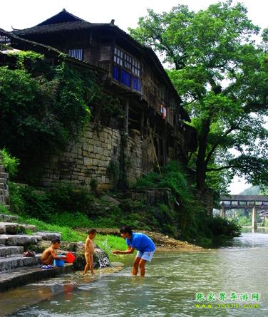 民宅多為吊腳木樓,依山傍水而建,臨河者倒影澄潭如水中街市,依山者雄峙高崖似空中樓閣。兩條河潔凈透亮,其中小河尤為美麗,青山夾岸,綠水長(zhǎng)流,河畔蓼紅芷白,桂馥蘭芳,素有“香溪”之稱(chēng)。其水盡來(lái)自溶洞,距街三里之內(nèi),就有魷魚(yú)洞、犀牛洞、王家洞、向家洞幾股洞泉和一個(gè)叫“雞屎潭”的溫泉。 “雞屎潭”來(lái)有濃重的硫磺味,水溫如沸,除污力極強(qiáng),根本不需肥皂便能將汗?jié)n洗得干干凈凈,并能醫(yī)治瘡疥,維護(hù)皮膚健康。河中多魷魚(yú),肉嫩且肥,立冬前盡逆水潛入溶洞起冬,立夏前兩三天則成群結(jié)隊(duì)隨夏汛而出,鄉(xiāng)人在洞口安上網(wǎng)壕,只需“守株待兔”,便能得到豐盛的收獲。在20世紀(jì)70年代以前,有時(shí)每天可得幾百斤。 小河灘多流急,是漂流的極佳去處。