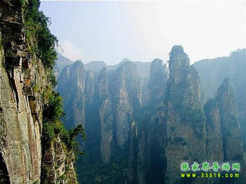 臺(tái)東五米處,一懸?guī)r突兀橫伸,下嵌深谷,曰“拜仙臺(tái)”。憑欄環(huán)顧,鷂子寨、羊寨、黑樅垴猶如翠屏,依天并列。臺(tái)下金鞭溪蜿蜒東去,沙刀溝穿峰南向。深邃幽暗的谷地中,十多座石峰錯(cuò)落有致,崢嶸秀偉,構(gòu)成一幅巨大的“群仙聚會(huì)”勝景,令人虔恭委質(zhì),肅然膜仙。