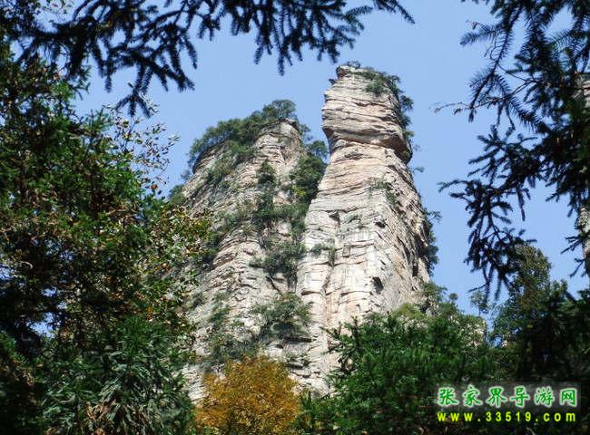 兩支山峰圍成一道天然小石門(mén),大有“一夫當(dāng)關(guān),萬(wàn)夫莫開(kāi)”之勢(shì),人稱(chēng)南天門(mén),據(jù)說(shuō)過(guò)了這道門(mén)就是天堂。不過(guò),說(shuō)來(lái)也奇怪,穿過(guò)山門(mén)之后,山勢(shì)為之一變,奇峰怪石,蒼松翠柏,美不勝收,不是天堂,勝似天堂。前面這支位于南天門(mén)身邊高200多米的孤立石峰,叫南天一柱。它與一般的山峰不大相同,一般的山峰是下面粗、上面細(xì),而它是上面粗、下面細(xì)。山風(fēng)吹來(lái),這根石柱好像搖搖欲墜,驚心動(dòng)魄之余,仿佛耳邊還能隱隱約約聽(tīng)到億萬(wàn)年前地殼運(yùn)動(dòng)時(shí)發(fā)出的轟隆隆的巨響——為了“安全”我們還是繼續(xù)往前走吧。