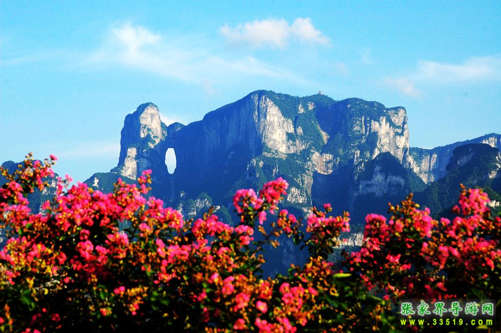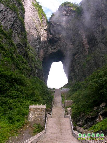 天門洞位于天門山山體的中上部,是世界上最高海拔的天然穿山溶洞,海拔1300米 ,其高131.5米,寬57米 ,深60米。它南北對開于千尋素壁之上,扶搖而通天,似明鏡似天門鑲嵌于蔚蔚天幕之上,終年吞云吐霧,蔚為壯觀中更加神秘莫測。“天門洞開云氣通,江東峨眉皆下風”元朝的著名詩人張兌曾這樣贊嘆,磅礴的氣勢由此可見。1700多年來,這一道奇絕天下的勝景吸引著無數(shù)的探訪者趨之若騖。特別是在1999年,世界特技飛行大師架機穿越天門洞,在全球引發(fā)了轟動效應(yīng),收看現(xiàn)場直播的觀眾達到8億之多。