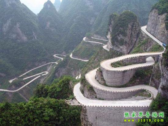 極具險絕奇觀的天門山盤山公路——“通天大道”則是天門山的另一壯景。通天大道態(tài)勢險絕,蕩氣回腸,更以蜿蜒迂回穿行于山體絕壁之天險而“堪稱天下第一公路奇觀”。它全長10.77公里 ,從標志門直達天門洞腳下,海拔從200米急劇提升至1300米,共有九十九個彎,大道兩側(cè)絕壁千仞,空谷幽深,180度的急彎此消而彼長,層層疊起,中國書法協(xié)會常務(wù)副會長 沈鵬 先生走過通天大道后欣然為其題字“曲道通天”,字體遒勁挺拔,與通天大道的奇絕天下相融為一體。