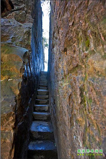 要繼續(xù)前進(jìn)的路,悄然間已不那么分明,鉆洞繞石,似路非路,幾米外便難見(jiàn)人,百余米的路,艱難曲折,人需要彎腰才能上行。第二道鬼門(mén)關(guān)“誰(shuí)能不低頭”便擋道于此。近百米的陡坡幾近直立,石路從兩塊巨石間穿過(guò),人須側(cè)身才能慢慢上行,一夫當(dāng)關(guān),萬(wàn)夫莫開(kāi)。“一夫關(guān)”是第三道鬼門(mén)關(guān)。烏龍寨能立足多年,并非徒有虛名。