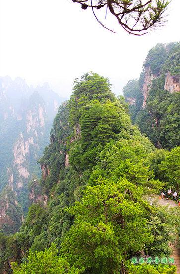 憑欄環(huán)望,諸峰拱立,百態(tài)千姿,近在咫尺。天氣凈朗時(shí)候,山石節(jié)理,松柏古木,依稀可辨。欣賞奇峰高崗,我們或者因?yàn)橹荒苓h(yuǎn)觀,或者因?yàn)樯碓趶]山難識(shí)其真面目,一步登天能夠給你一個(gè)細(xì)細(xì)玩賞的機(jī)會(huì)?;赝哌^的楊家界,層巒疊嶂,濃淡相宜,眺望,黃獅寨、張家界……若隱若現(xiàn),秀色可餐。