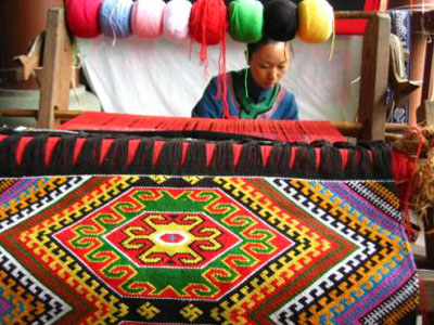 土家織錦是土家婦女用一種古老的木腰機,以棉紗為經(jīng),對五彩絲線或棉線(當(dāng)今也有用毛線的) 為緯,完全用手工織成的手工藝術(shù)品。