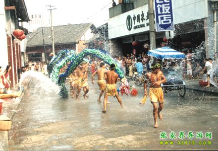 張家界潑水龍又叫“澆水龍”,于唐朝時(shí)期由移居本地的白族興起演變而成,在永定區(qū)的尹家溪鎮(zhèn)西尹村、莫家崗村十分盛行,是當(dāng)?shù)?a class="insidelink" href="http://www.dmpagroup.com/fengqing/" title="土家族">土家族,白族、苗族在天熱干旱時(shí)節(jié)求雨祈福的一種形式。一旦出現(xiàn)旱災(zāi),當(dāng)?shù)仡^面人物就會(huì)出來組織潑水龍,演出極其隆重。