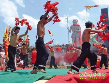搖鈴隊(duì)伍圍圓圈有節(jié)拍的搖鈴。圓圈中另兩人面對(duì)面用肩共杠一根齊眉棍(木桿),左手叉腰,右手扶棍。從棍上搭一疋絲帕,一氣功師進(jìn)來(lái)拿絲帕一頭,另一壯漢拿線帕另一頭。氣功師手拿絲帕慢慢下蹲,壯漢牢牢握緊絲帕。待氣功師翻天睡在地上后,其他人搬一床棉被蓋其肚部,再在上面放一塊木板,木板上放一副大石磨,石磨上架一套鐵犁、粑。氣功師睡在地上用右手打竹掛,口喊:"打個(gè)陰陽(yáng)一只"!把竹掛打在地上,掛未成陰陽(yáng)一只時(shí),還要繼續(xù)打,直到打成,才把放在氣功師肚部的所有東西取下,氣功師雙手握緊絲帕慢慢起身站立。表演結(jié)束。