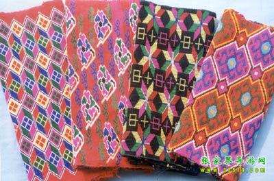 織錦。又名“西蘭卡普”、“土花鋪蓋”,為土家族傳統(tǒng)工藝品之一,是森林公園工藝品廠的主要產(chǎn)品。織錦是在特制的本質(zhì)織機(jī)上以錦紗為經(jīng)、五彩絲線為緯、手工提花織成。以其質(zhì)地厚實(shí)、堅(jiān)韌,色彩鮮艷,格調(diào)古樸,流暢生動(dòng)著稱。圖案有花草、鳥獸、生產(chǎn)、生活、幾何、字樣等種類。為舊時(shí)土家姑娘必備嫁妝之一。據(jù)考證,早在漢代,土家織錦就作為方物貢入漢室宮廷。20世紀(jì)后,土家織錦曾漂洋過海至日、美、英等國展出,并作為禮品,被國家領(lǐng)導(dǎo)人贈(zèng)送給外國元首及政府官員,如今織錦以壁掛、枕巾、沙發(fā)墊、桌圍、提袋、服飾等多種式樣遠(yuǎn)銷世界各地。