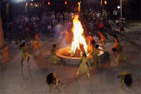 擺手舞的形式一般是這樣的:在擺手堂的中央高掛龍旗,四方點(diǎn)燈,由金童玉女給土家人用銅盆洗手,再?gòu)南慊鹕饺砩窕?,然后在龍旗下點(diǎn)燃3堆篝火。隨著3聲炮響,先由梯碼法師(巫師)手舉八寶銅鈴作前導(dǎo),大家跟著翩翩起舞,徹夜不眠。