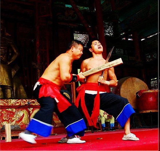 大庸氣,堪稱武林奇葩,曾為祖國贏得聲譽(yù),海內(nèi)外享有極主名望。 大庸氣功是大庸各民族特別是土家族傳統(tǒng)體育項(xiàng) 目之了,分健體氣派、武術(shù)氣功兩類。前者有“返還 功”、“馬王推氣功”、“少林達(dá)摩醫(yī)療保健氣功” 等;后者有靜坐、壁虎、靈子、二指彈、碎石、松靜 、硬氣、五禽、五陽功等,尤以硬氣功著稱。大庸硬 氣功,歷史悠久,漢代相單程,明代覃后,清代劉明 燈,當(dāng)代湯子模、周鐵鞭、杜心武、趙繼書等都具有 超人硬氣武功。大庸土著民族在漫長的反征服、反壓 迫斗爭,博采武當(dāng)、少林南北派、昆侖派眾家武林精 華,創(chuàng)造出獨(dú)此一家的大庸硬氣功。 據(jù)傳,大庸硬氣功鼻祖是楚國鬼谷子?!队蓝h 志》有關(guān)鬼谷子隱居天門山鬼谷洞潛心學(xué)《易》、傳 授方術(shù)的記載。到清代有武林高手朱茂嶺,隱居三岔 村北芭蕉灣洞,研究鬼谷氣功之術(shù),后收西溪坪胡口 子、余世萬(即“余通人”)為徙,傳其衣缽。余通 人將武術(shù)氣功系統(tǒng)整理,發(fā)揚(yáng)光大,播名于世。 新中國成立后,黨和政府十分重視民間氣功發(fā)掘 整理,并正式列為體育項(xiàng)目加以普及發(fā)展,今日大庸 市習(xí)練硬氣功達(dá)數(shù)萬人眾。永定區(qū)官黎坪村世有“硬 氣功之鄉(xiāng)”盛譽(yù),該村男女老幼,練功已蔚成風(fēng)氣, 其武師趙繼書,1979年先后參加全省和全國武術(shù)大賽 ,均獲一等獎(jiǎng),受到國家體委重視,同年7 月趙繼書 專程到北京給中央領(lǐng)導(dǎo)同志匯報(bào)表演。嗣后,隨同中 國武術(shù)代表團(tuán)和國家領(lǐng)導(dǎo)人先后兩次出國,到盧森堡 、意大利、比利時(shí)、羅馬尼亞、馬其他和東南亞等國 家訪問。他表演的臥刀碎石、頭頂開石、雙鳳灌耳、 頭碰石柱、叉尖推磨等精彩節(jié)目,博得外國友人好評(píng) 。盧森堡一位榮獲國家獎(jiǎng)牌的武士,看了表演后連夜 來到中國大使館,將自己珍藏多年的獎(jiǎng)牌贈(zèng)送給他; 盧森堡國王主動(dòng)熱情走上臺(tái)與趙繼書熱情擁抱,連連 稱贊:“了不起!了不起!國際氣功大師!”并把珍 藏紀(jì)念章一枚贈(zèng)送給趙繼書。一位法國朋友十分贊賞 說:“中國的氣功,稱為全人類的寶貴財(cái)富,是有科 學(xué)道理的。”自此,大庸硬氣功譽(yù)滿全球。湖南瀟湘 電影制片廠專門拍攝了彩色紀(jì)錄片《大庸氣功》。 大庸硬氣功共有二十多個(gè)項(xiàng)目,最有影響的是: 腹臥鋼叉 由二人在地面扶住一根叉尖朝上的三 股鋼叉,叉尖猁鋒利,然后一個(gè)俯身叉尖,尖抵腹部 ,待其四肢平展懸空,扶叉二人轉(zhuǎn)動(dòng)鋼叉,謂之推磨 。表演時(shí),要求臥叉者運(yùn)氣于腹,氣意集中,稍有大 意,叉即穿腹而過。 臥刀破石 先固定兩把大刀,刀口朝上,臥刀者 運(yùn)氣后,由其他人抬臥于刀口上(有仰臥、俯臥兩種) ,然后在臥刀者腹部或背部置一碩大石條(約數(shù)百斤) ,一人或兩人輪大鐵錘狠擊石條直至斷裂破碎為止。 釘?shù)洞财剖?地上倒一層碎玻璃片,一人仰臥其 上;然后腹上置釘床,又一人仰臥釘床上,再于第二 人腹上置釘床,第三人仰臥刀床上,腹部上壓一塊數(shù) 百斤大條石,由人掄錘狠砸,至石破為止。 銀槍刺喉 用一根兩頭安有鋒利槍頭的鋼槍,抵 置兩位表演者喉部,然后相對(duì)發(fā)力,至槍桿抵成彎弓 形而喉部安然無恙。 徙手?jǐn)嗍?表演者將堅(jiān)滑如鐵一塊卵石置于石凳 (地)上,然后運(yùn)氣于掌或指擊斷(碎)卵石。 踢腿斬石 表演者運(yùn)氣于腿,以腿踢斷石條。一 般可踢斷15公分以上厚度的麻石條或青石條。 胸部打刀 將鋒利大刀刃口置于胸部肌肉上,用 一根拳頭粗木棒猛擊刀背,至棒斷而胸部無傷。 新中國成立以來,大庸民間武術(shù)與民族體育逐漸 融為一體,發(fā)揮著提高人民身體素質(zhì)、弘揚(yáng)中華武術(shù) 傳統(tǒng)和增進(jìn)國際友誼重大作用。除硬氣功外,還有數(shù) 十種武術(shù)形式散見于民間武術(shù)體育活動(dòng)之中。如打飛 棒、扭扁擔(dān)、抵搭斗杠、擠油渣、甩抱腰、舉石鎖、 板牛角(一種斗牛形式)等等。其特點(diǎn)是因地制宜, 不分場(chǎng)地,凡田園地角院壩集鎮(zhèn),都是習(xí)武練功、開 展活動(dòng)的處所,頗具泥土氣息。擬或以生活中某些動(dòng) 作和動(dòng)物的某種形態(tài),稍加模仿演繹,便成某一獨(dú)特 武術(shù)形式。如天門武術(shù)功夫大師余道人所創(chuàng)造的“宮 天梳”、“巖燕樸天門”等;也有就地理特點(diǎn)創(chuàng)造某 種武功形式的,如“蕩藤”等。