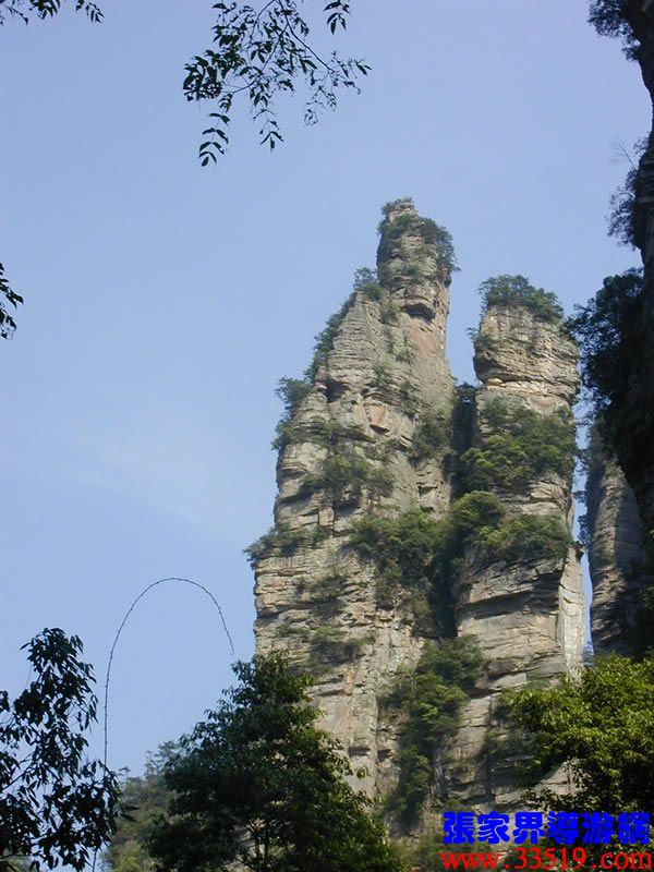 (花果山、水簾洞)孫悟空的花果山水簾洞到了。并不是張家界人過于牽強,胡亂把西游記的事兒往這兒湊,實在是巧合,《西游記》劇組的導游楊潔及唐僧、豬八戒、孫猴子、沙和尚等飾演者,一見到這地方就十分肯定地說:外景地選遍全國,只有張家界才真正是《西游記》筆下的神仙妖魔世界。大家順著我的指向往前看,左前方是帶著僧帽,披著袈裟,嘴中念念有詞的唐僧,緊跟在他后面的那座黑乎乎的石峰當然就是沙和尚了;神通廣大的孫猴子半蹲在唐僧后側(cè)手搭涼篷,正在觀察敵情呢;豬八戒哪去了?不用說,不是貪吃貪睡,就是偷偷找小女子搭訕去了,花心去了。