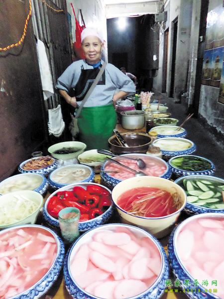 鳳凰本地人介紹好吃的,總是推薦姜糖、獼猴桃等,事實(shí)上,當(dāng)?shù)匦∠锷钐幍呐莶送瑯恿畈簧儆慰唾澆唤^口。酸酸的泡菜可以是豆角,也可以是當(dāng)?shù)靥赜?的紅心蘿卜、刀豆、包菜、涼薯等,這些都可以成為泡菜原料,每種原料用陶缽盛著擺在架子上。想吃什么,自己用筷子夾了放一起。過完秤,可以根據(jù)自己的喜好 放辣椒粉或白糖拌(辣椒粉還分微辣、猛辣),往旁邊小桌上坐下,邊吃邊看著古街上那些匆匆而過的游客,那種感受絕不亞于在國(guó)外街頭喝咖啡賞景。