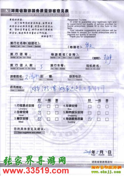2010年5月3號(hào)湘潭王先生一行5位旅游質(zhì)量反饋