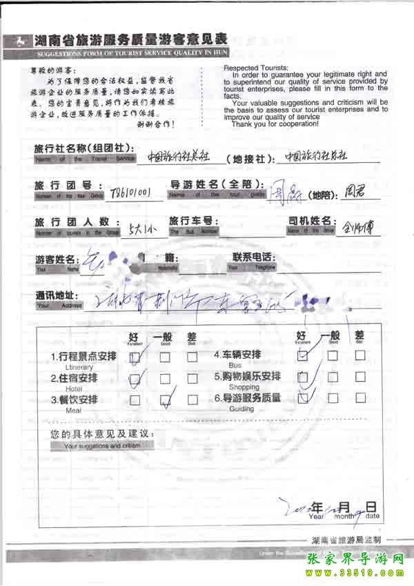 2010年10月4日湖北張先生一行6位旅游質(zhì)量反饋